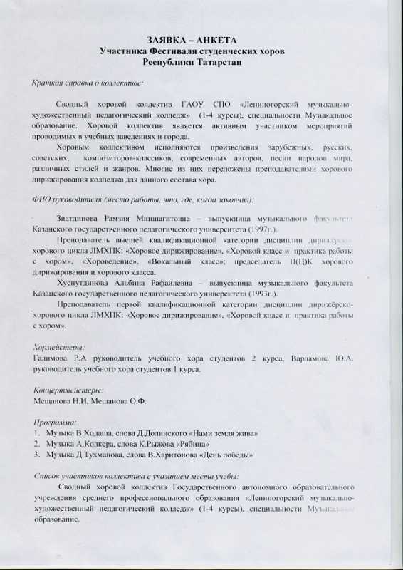 Заявка-анкета Лениногорский музыкально-художественный педагогический колледж